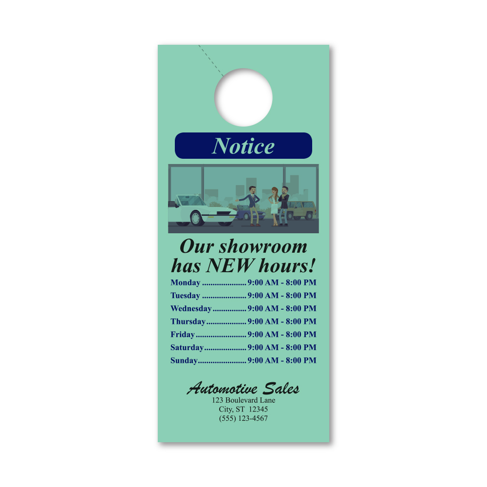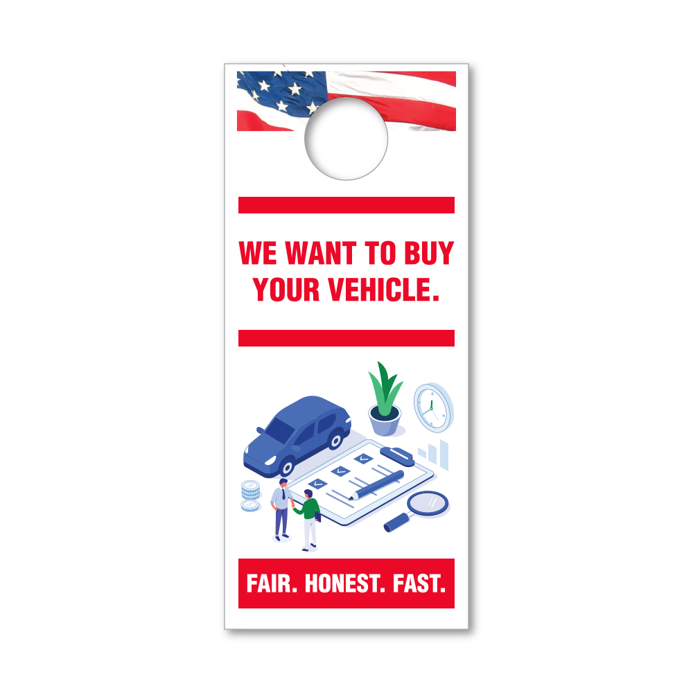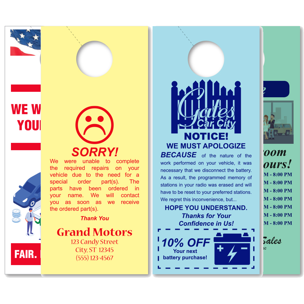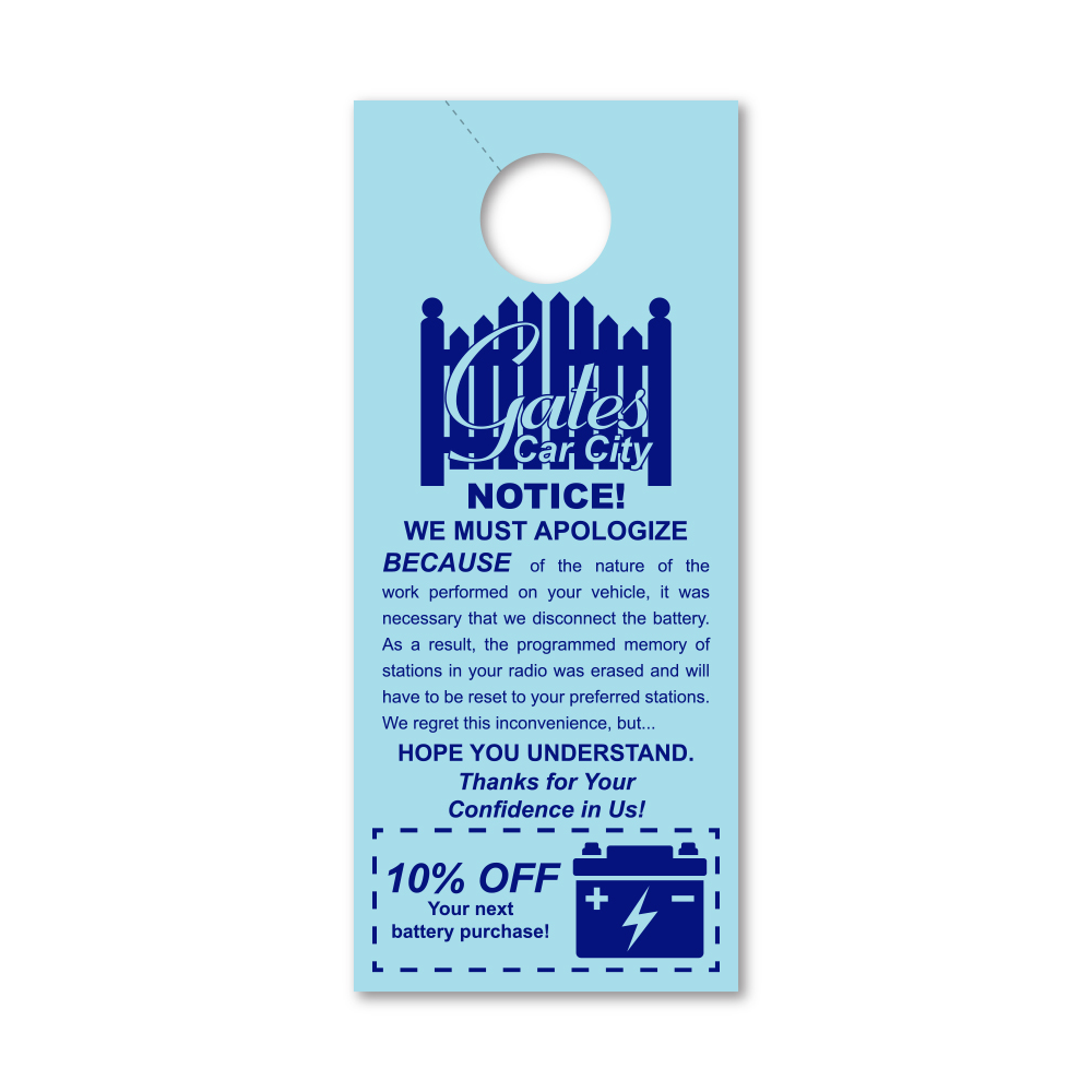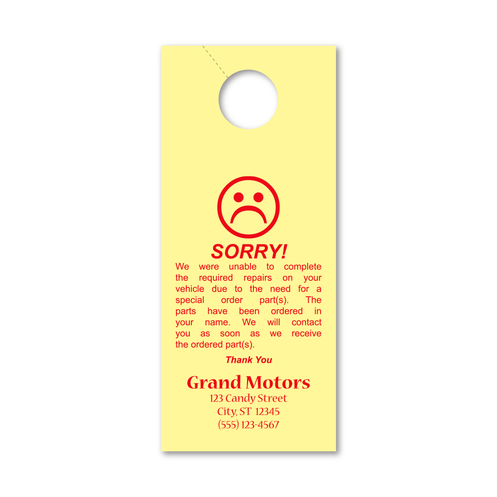 Hangs on rearview mirror and is an excellent way to communicate with your customer.
