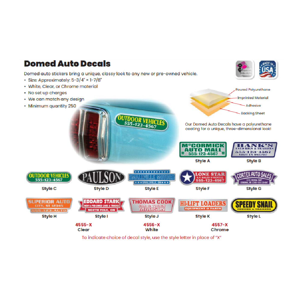 Domed auto stickers bring a unique, classy look to any new or pre-owned vehicle.
