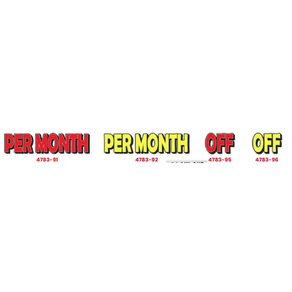 • Numbers, $, % are packaged 1 per pack; the comma, period, and slogans are packaged 2 per pack