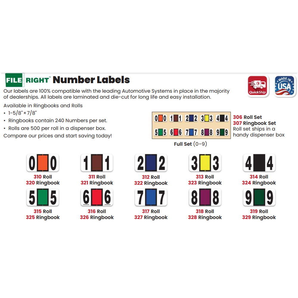 Our labels are 100% compatible with the leading Automotive Systems in place in the majority of dealerships. All labels are laminated and die-cut for long life and easy installation. Available in Ringbooks and Rolls