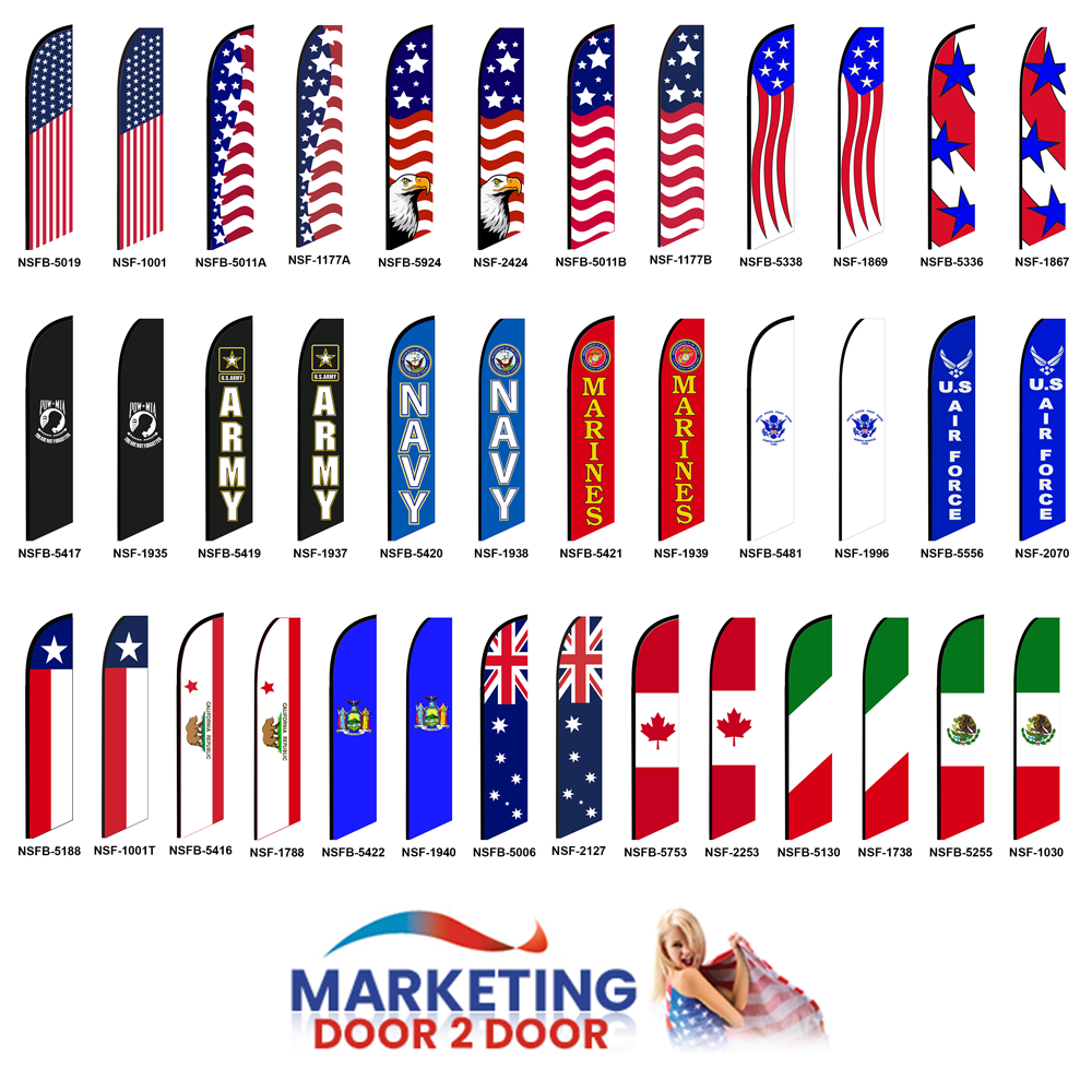 These high-quality, 12′ tall professionally sewn swoopers display great with or without wind. These flags have a sewn sleeve that fits over our 4 piece pole set. Once the swooper is mounted on the pole set it reaches a height of over 15′. We have a large variety of methods to display the flag.